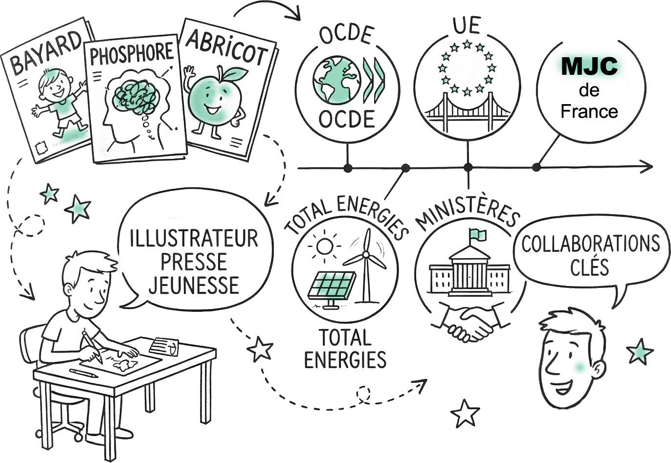 Ancien illustrateur presse jeunesse (Bayard, Phosphore, Abricot…).Collaborations avec OCDE, UE, WWF, Total Energies, ministères...